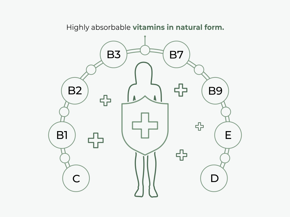 Unlike randomly mixed multivitamin supplements, LiveLin contains only highly absorbable vitamins in natural form: C, B1, B2, B3, B7, B9, E and provitamin D.