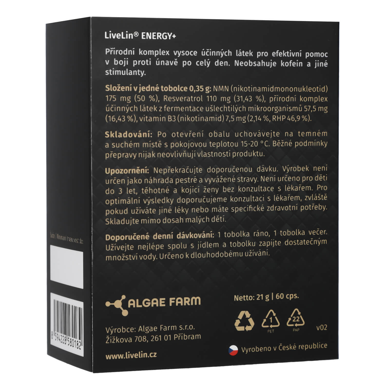 LiveLin® Energy+ is designed as a complex of highly effective substances with high absorbability and synergistic effects of individual components. With long-term regular use, it provides a stable source of energy throughout the active day. It supports energy biochemical processes that maintain energy and reduce fatigue. Unlike similar products, it does not contain caffeine or other stimulants, and therefore does not cause energy fluctuations, mood swings, digestive tract irritation or other negative side effects such as nervousness, heart palpitations, rapid fluctuations in blood sugar levels, etc.