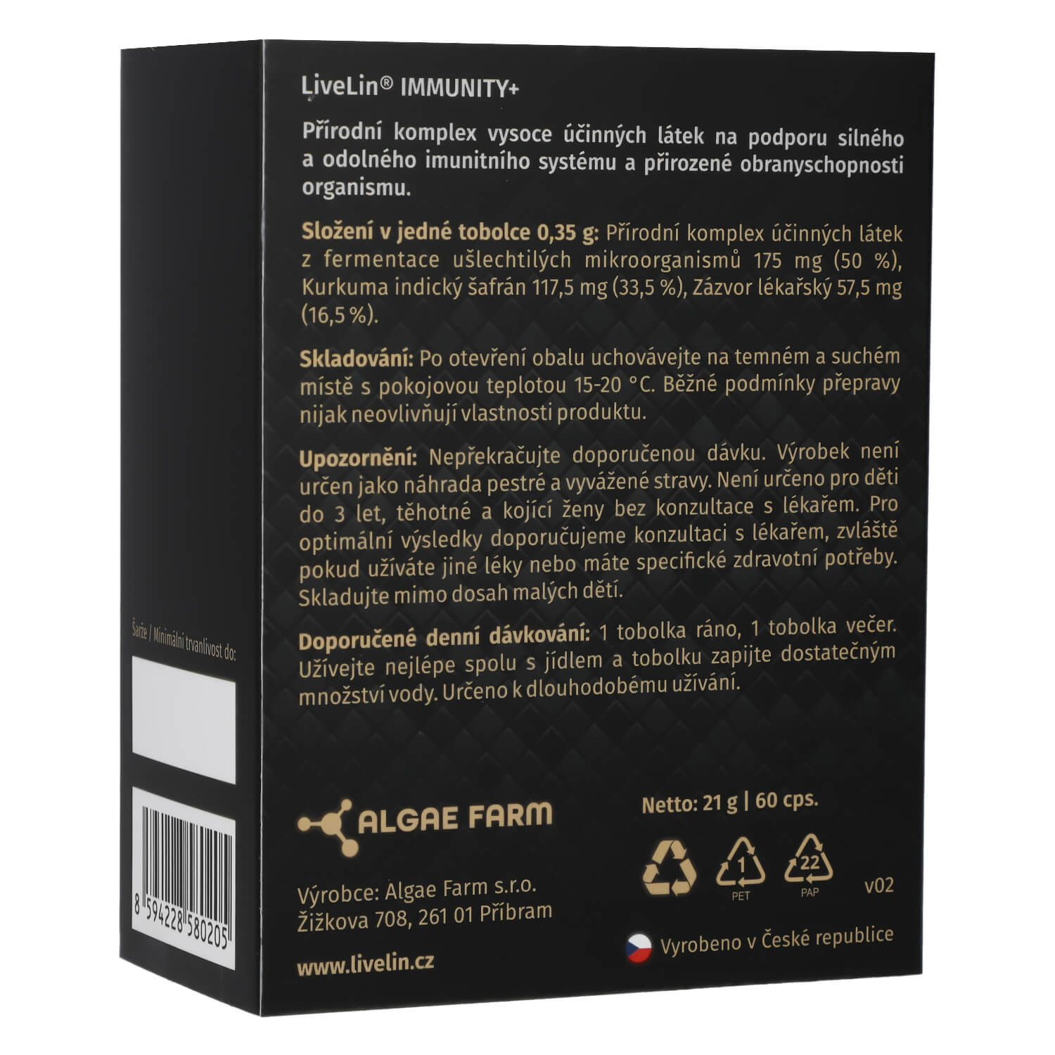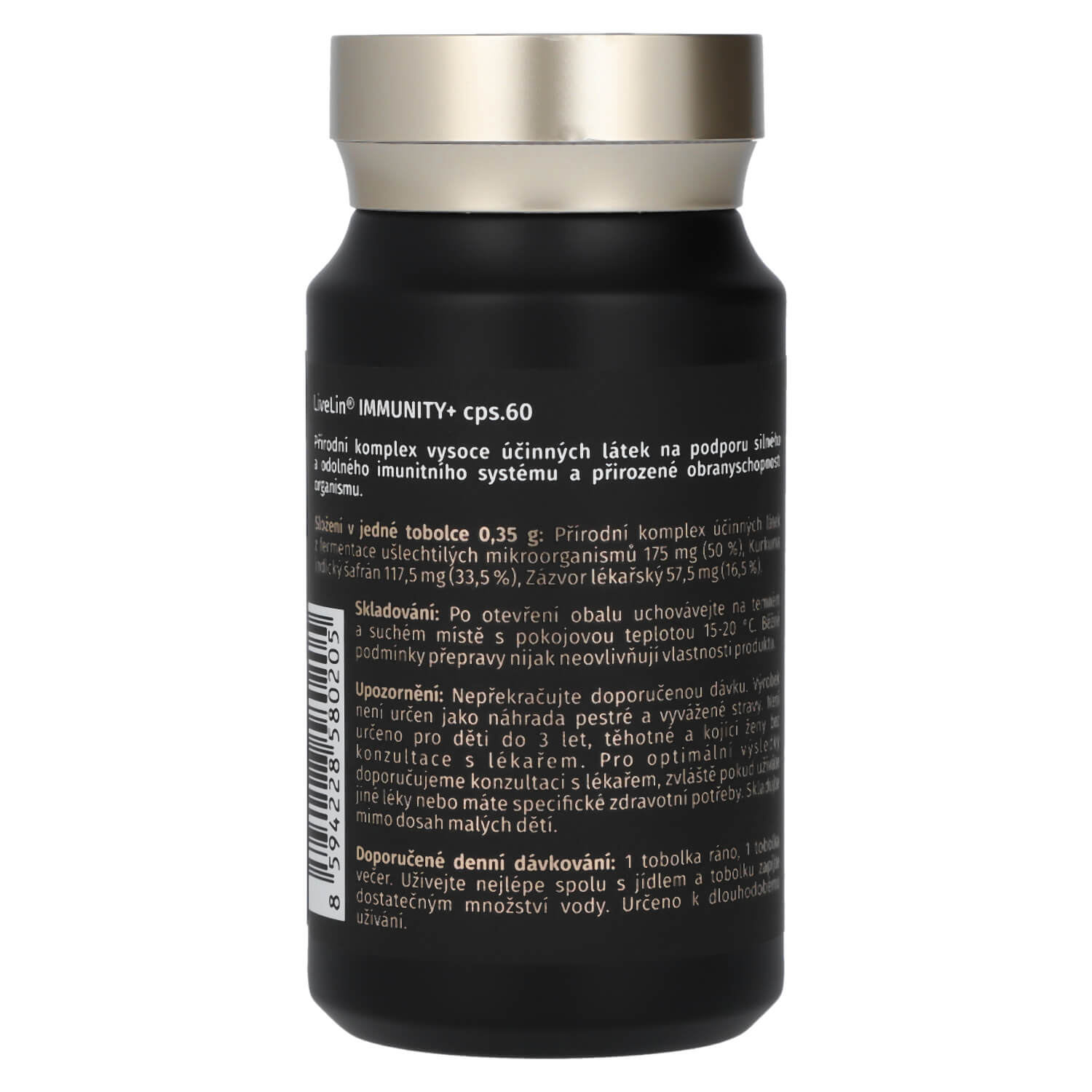 LiveLin® Immunity+ is a complex of highly effective substances with high absorbability and synergistic effects of individual components. The mixture is stored in an enteric-coated capsule for perfect protection against biodegradation of the active substances by stomach acid. It contains the most powerful natural immunostimulants, antioxidants, anti-inflammatory substances, and other ingredients that support long-term health and resistance to disease. Unlike synthetically produced products that support immunity, which often have no significant effect on health.
