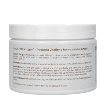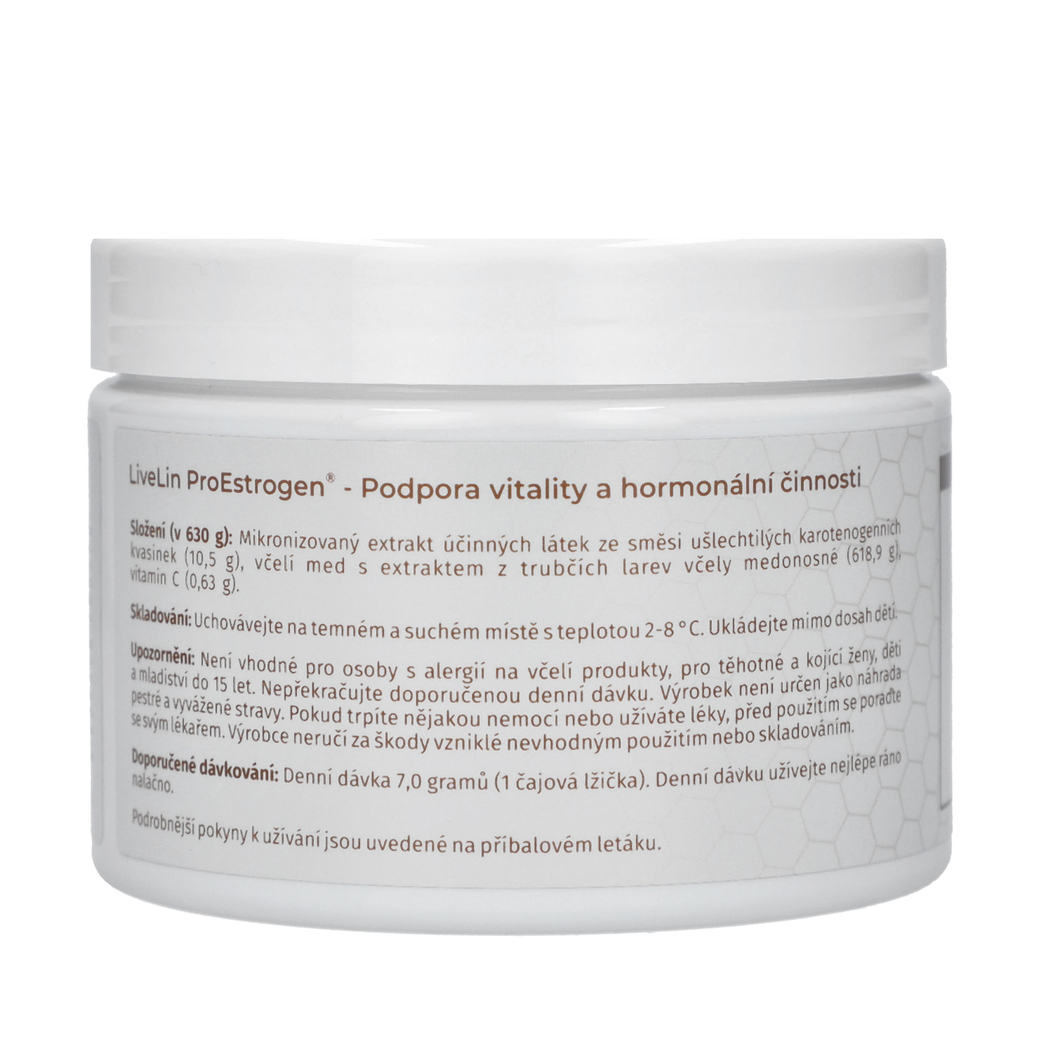 LiveLin® ProEstrogen is an all-natural blend of freeze-dried extract from honey bee larvae (in the late stage of larval development) and micronized biomass, produced by a biotechnological fermentation process that uses noble yeasts to produce active ingredients essential for longevity and lasting health. The mixture is stored in a honey emulsion for perfect protection against biodegradation of the active ingredients. The product contains no additives, colorants, flavorings or stabilizers.