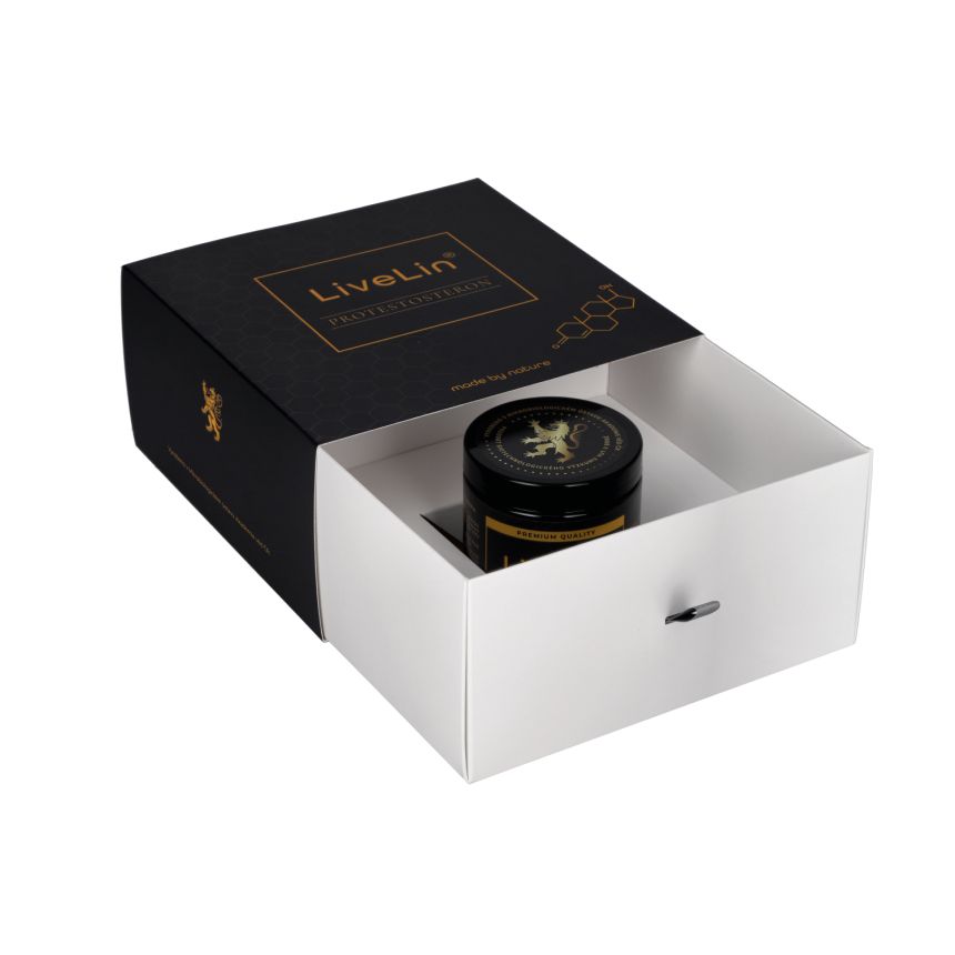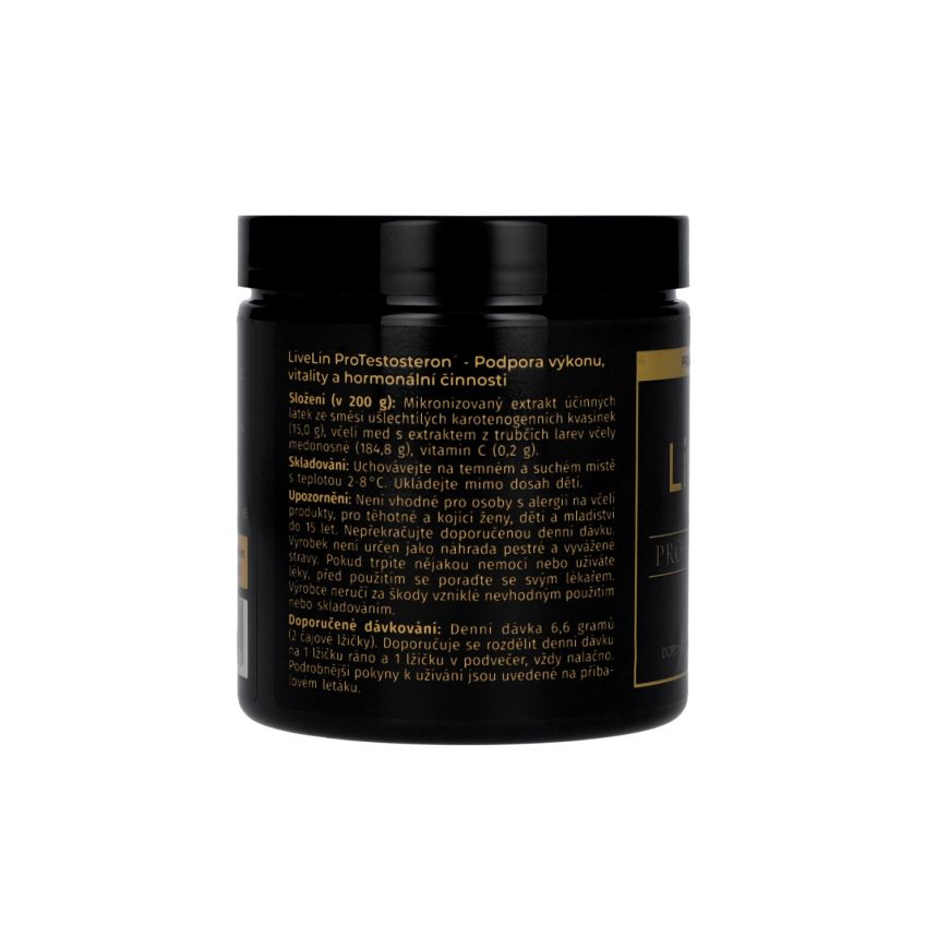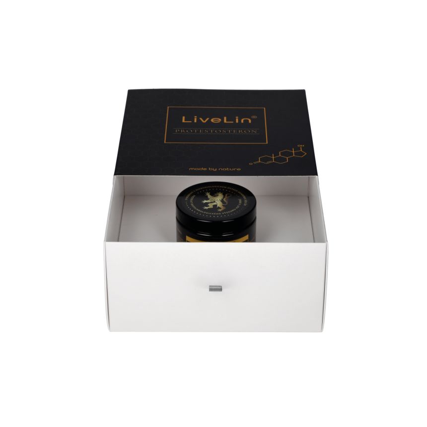 The LiveLin® ProTestosterone dietary supplement is a purely natural blend of freeze-dried extract from honey bee larvae (in the early stage of larval development) and micronized biomass, produced by a biotechnological fermentation process that uses noble yeasts to produce active ingredients essential for longevity and lasting health. The mixture is stored in a honey emulsion for perfect protection against biodegradation of the active ingredients. The product contains no additives, colorants, flavorings or stabilizers.